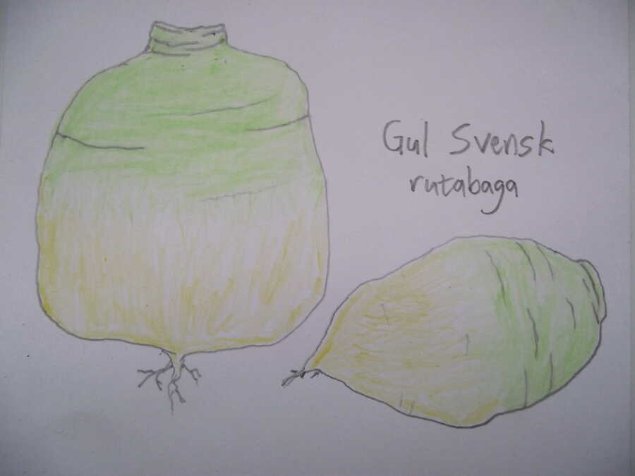 A landrace turnip from northern Finland whose most striking feature is its coloration: a yellow base layer with stripes and speckles of purple, sometimes so dense as to be nearly all purple, sometimes with almost none. Flesh can be white or yellow. Flat-round shape, good storage life, and traditional turnip flavour – in fact, all the traditional turnip flavours included in its variability! Some more sweet, some a bit bitter, some mild, some very strong… that’s how landraces sometimes are.